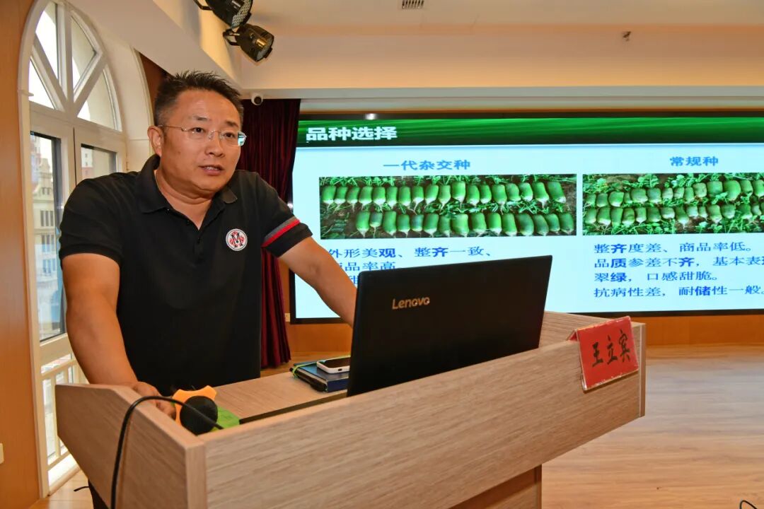 在理论授课环节,市农科院蔬菜研究所、蔬菜育种和推广专家、第十三届民革“三农”委员会委员王立宾副研究员围绕《脆甜高品质沙窝萝卜新品种配套栽培技术》,从品种介绍、施肥、旋耕、播种、浇水、苗期病虫害防治等方面作了授课辅导;天津农学院园艺园林学院植物保护系崔新仪教授围绕《农产品安全生产与绿色防控》,从农产品安全生产的规范、绿色防控、使用农药的注意事项等方面作了深入浅出的讲解。在实地指导环节,全体人员集体乘车来到绿亨沙窝萝卜种植基地,实地察看了沙窝萝卜埂上种植技术、节能灌溉技术的应用、病虫防治等情况,基地技术人员向大家介绍了整个基地的种植与管理情况,两位专家针对菜农们的提问,一对一进行解答,什么时候浇水、什么时候施肥、怎样防治病虫害等,都讲得明明白白。