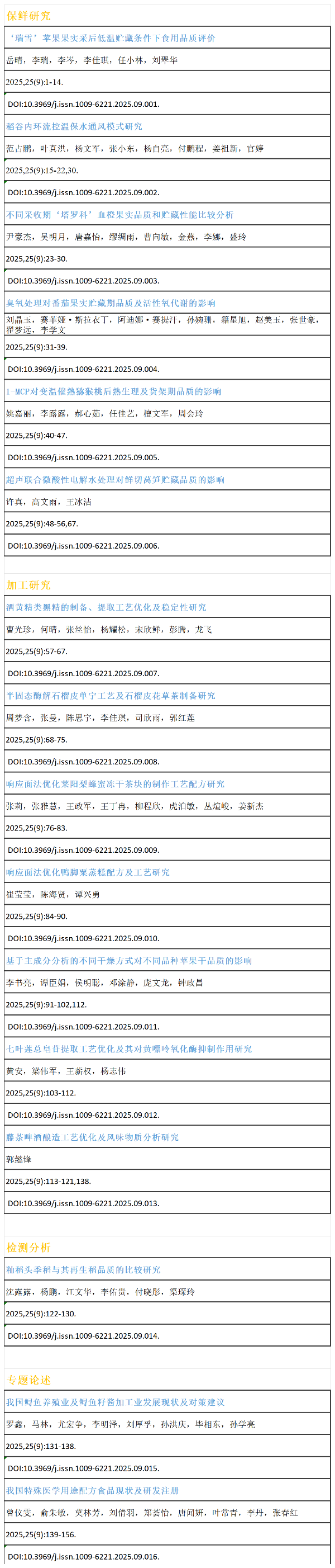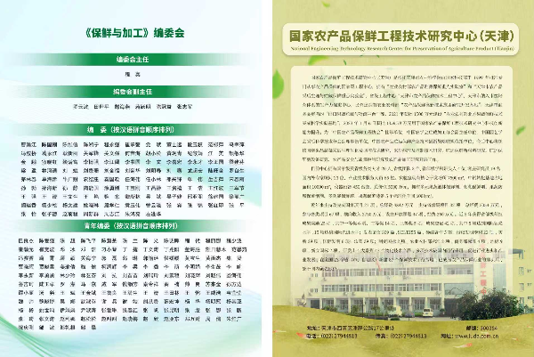《保鲜与加工》期刊是天津市农业科学院主管主办的农产品采后技术研究领域的科技期刊,为中国科技核心期刊、RCCSE 中国核心学术期刊、中国农林核心期刊和中国北方优秀期刊,已被中国学术期刊(光盘版)、维普网、万方数据库、超星数据库、学术中国-知识产权服务平台、美国化学文摘(CA)、英国《食品科技文摘》(FSTA)、EBSCO数据库、英国《国际农业与生物科学研究中心》(CABI)及WJCI收录,2021年获得天津市优秀出版物期刊奖。据中国知网的最新统计结果,《保鲜与加工》杂志的复合影响因子为2.034。本刊主要报道农产品保鲜与加工相关领域基础理论、新技术、新工艺、新设备、新材料的研究成果及国内外相关行业的动态与信息,设置专家论坛、保鲜研究、加工研究、检测分析、信息与物流、专题论述、技术指南等栏目,适于科技人员、农业技术推广人员、相关企业管理和技术人员、大专院校师生及广大从事保鲜与加工技术研发领域的人士参阅。 《保鲜与加工》期刊为月刊,大16开,每月20日出版,国内外公开发行,每期定价25元。国内统一连续出版物:CN12-1330/S,国际标准连续出版物号:ISSN1009-6221,邮发代号:6-146。唯一投稿平台www.bxyjg.com。