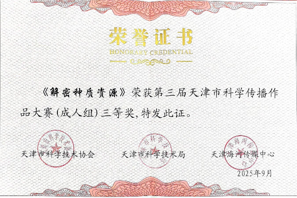日前,市科协、市科技局、天津海河传媒中心联合举办第三届天津市科学传播作品大赛,我院科普动画视频《解密种质资源》荣获大赛(成人组)三等奖。
