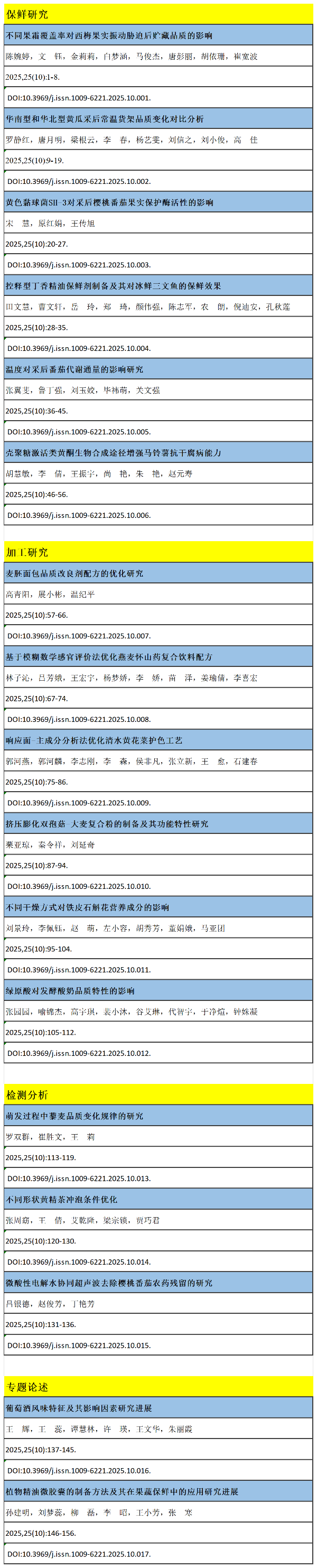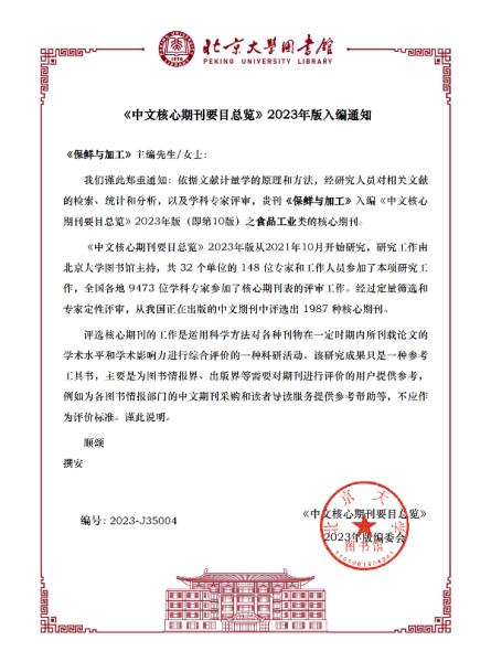 《保鲜与加工》期刊是天津市农业科学院主管主办的农产品采后技术研究领域的科技期刊,为中国科技核心期刊、RCCSE 中国核心学术期刊、中国农林核心期刊和中国北方优秀期刊,已被中国学术期刊(光盘版)、维普网、万方数据库、超星数据库、学术中国-知识产权服务平台、美国化学文摘(CA)、英国《食品科技文摘》(FSTA)、EBSCO数据库、英国《国际农业与生物科学研究中心》(CABI)及WJCI收录,2021年获得天津市优秀出版物期刊奖。据中国知网的最新统计结果,《保鲜与加工》杂志的复合影响因子为2.034。本刊主要报道农产品保鲜与加工相关领域基础理论、新技术、新工艺、新设备、新材料的研究成果及国内外相关行业的动态与信息,设置专家论坛、保鲜研究、加工研究、检测分析、信息与物流、专题论述、技术指南等栏目,适于科技人员、农业技术推广人员、相关企业管理和技术人员、大专院校师生及广大从事保鲜与加工技术研发领域的人士参阅。 《保鲜与加工》期刊为月刊,大16开,每月20日出版,国内外公开发行,每期定价25元。国内统一连续出版物:CN12-1330/S,国际标准连续出版物号:ISSN1009-6221,邮发代号:6-146。唯一投稿平台www.bxyjg.com。