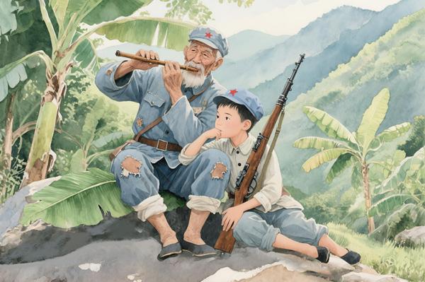 收藏于中国人民革命军事博物馆的雕塑作品《艰苦岁月》,塑造了这样一个情景:一老一少两位红军战士相互依偎,老红军在吹笛子,小红军伏在他的膝头静静倾听。作品的原型是在海南岛母瑞山艰苦斗争的琼崖红军。