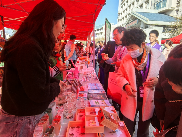 展区精心设置五大特色板块,让种质资源、生物育种等专业知识走出课本、走进生活。“科学实验体验区”人气爆棚,试纸条检测、发芽小实验等趣味项目邀请观众亲手操作,在实践中观察现象、探索规律,直观感受科学原理的奇妙魅力;“种子展示区”如同微型“种子博物馆”,黄豆、绿豆、小麦等十余种常见作物种子整齐陈列,转基因与非转基因种子同步展示,通过实物对比让观众清晰辨识种子形态特征,深化对种质资源多样性和生物育种力量的认知;“文创展览区”实现科普与美学的跨界融合,种质资源滴胶挂件、昆虫主题文创等产品兼具知识性与趣味性,让科普在寓教于乐中深入人心;“标本展示区”堪称浓缩版“自然课堂”,以针插、液浸、滴胶等多种工艺制作的昆虫标本错落排布,全方位展现昆虫世界的奥秘,充分满足观众对自然科学的探索欲;“互动体验区”则为科普增添了纪念意义,观众可挑选心仪图案制作专属科普徽章,让科学记忆具象化,长久留存。