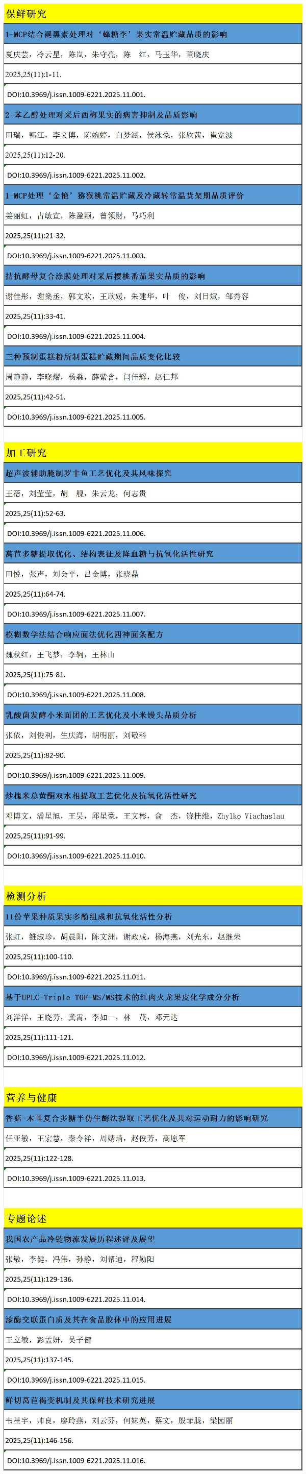 《保鲜与加工》期刊是天津市农业科学院主管主办的农产品采后技术研究领域的科技期刊,为中国科技核心期刊、RCCSE 中国核心学术期刊、中国农林核心期刊和中国北方优秀期刊,已被中国学术期刊(光盘版)、维普网、万方数据库、超星数据库、学术中国-知识产权服务平台、美国化学文摘(CA)、英国《食品科技文摘》(FSTA)、EBSCO数据库、英国《国际农业与生物科学研究中心》(CABI)及WJCI收录,2021年获得天津市优秀出版物期刊奖。据中国知网的最新统计结果,《保鲜与加工》杂志的复合影响因子为2.034。本刊主要报道农产品保鲜与加工相关领域基础理论、新技术、新工艺、新设备、新材料的研究成果及国内外相关行业的动态与信息,设置专家论坛、保鲜研究、加工研究、检测分析、信息与物流、专题论述、技术指南等栏目,适于科技人员、农业技术推广人员、相关企业管理和技术人员、大专院校师生及广大从事保鲜与加工技术研发领域的人士参阅。 《保鲜与加工》期刊为月刊,大16开,每月20日出版,国内外公开发行,每期定价25元。国内统一连续出版物:CN12-1330/S,国际标准连续出版物号:ISSN1009-6221,邮发代号:6-146。