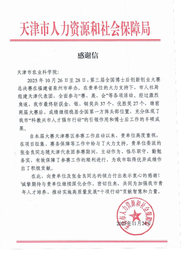 信中指出,自本届大赛天津赛区参赛工作启动以来,贵单位高度重视,在项目征集、赛务保障等工作中给予了大力支持。贵单位委派的张金良同志随天津代表团参赛期间,主动作为、恪尽职守、勤勉务实,有效保障了参赛工作的顺利进行,为我市取得优异成绩作出了积极贡献。