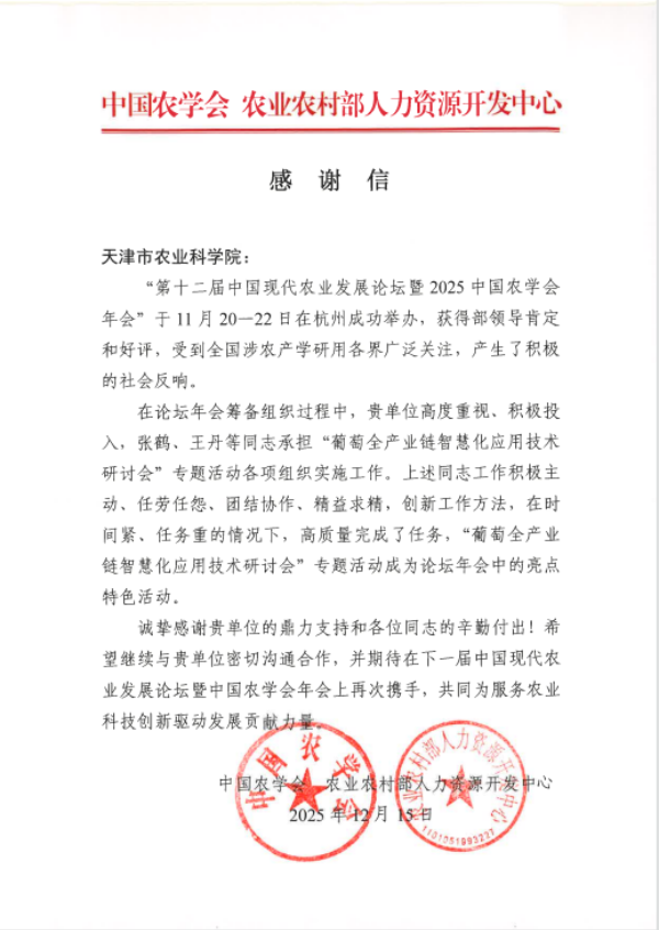 近日,中国农学会向我院林果所发来感谢信,对林果所作为中国农学会葡萄分会秘书处,在参与筹备“葡萄全产业链智慧化应用技术研讨会”期间所作的积极贡献,表示感谢和称赞。感谢信不仅是对我院工作人员辛勤付出的最大肯定与褒奖,更是对双方精诚合作、默契配合的生动诠释。