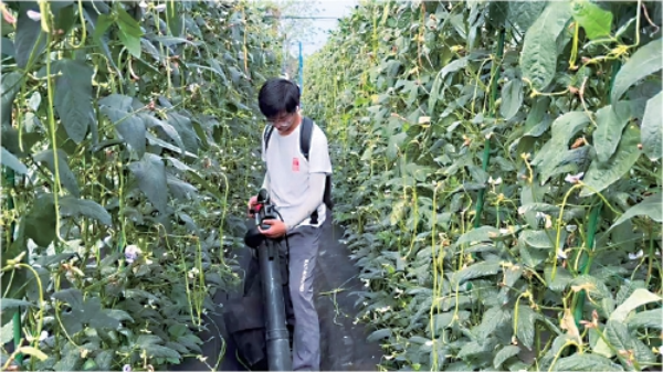这项技术的创新之处在于精准把握病虫害发生规律:花期前喷施绿僵菌CQMa421微生物药剂,提前压低蓟马虫口基数;清晨蓟马活动微弱时,摇晃藤蔓使藏虫花朵脱落,再用吸花机清除残花,从源头消灭虫源。“绿僵菌是昆虫内寄生菌物,对人畜和作物无毒,却有化学农药般的高效杀虫活性,持效期还长。”梁鹏介绍,结合60目防虫网大棚的物理阻隔,示范点豇豆病虫害发生率降低60%,化学农药使用量大幅减少。