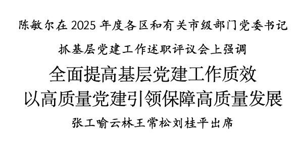 本报讯(记者 于春沣 刘国栋)1月6日,市委召开2025年度各区和有关市级部门党委书记抓基层党建工作述职评议会。市委书记陈敏尔主持会议并讲话。他强调,要深入贯彻习近平总书记关于党的建设的重要思想和视察天津重要讲话精神,以中央巡视反馈意见整改落实为契机,进一步压紧压实管党治党政治责任,全面提高我市基层党建工作质效,以高质量党建引领保障高质量发展,以实际行动体现深刻领悟“两个确立”的决定性意义、坚决做到“两个维护”。