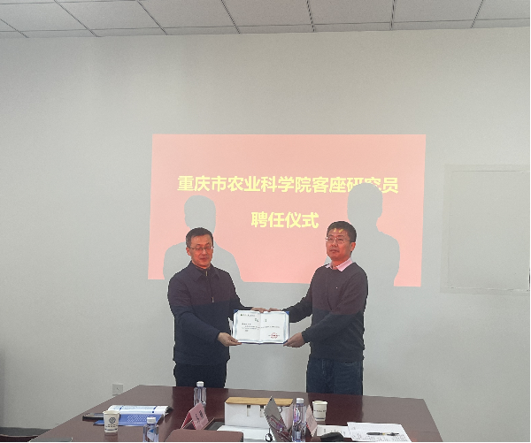 调研活动期间,重庆市农科院为我院陈锐博士颁发了客座研究员聘书。陈锐是我院选派的“博士服务团”成员,刚刚圆满完成在重庆农科院为期一年的挂职锻炼,其优异表现得到了重庆农科院的高度认可。