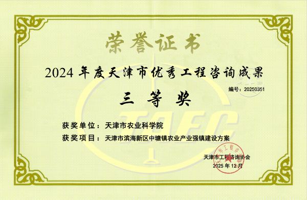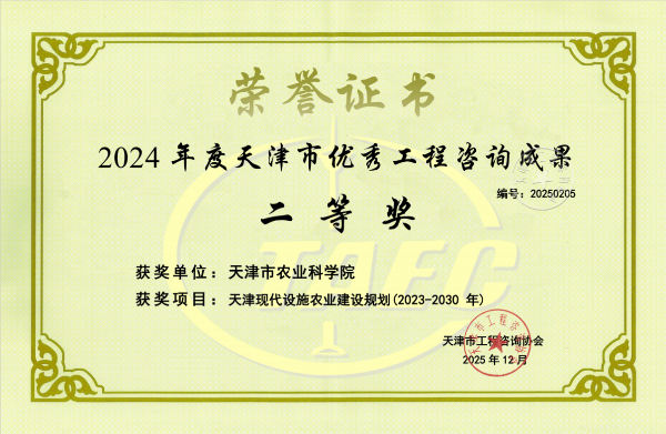 会议听取了天津市工程咨询协会第五届理事会2025年工作报告及2026年工作计划,表彰了2024年度天津市优秀工程咨询成果获奖单位。我院农经区划所主持完成的2项技术咨询成果分别获得优秀工程咨询成果二等奖和三等奖。其中,《天津市现代设施农业建设规划(2023-2030年)》荣获二等奖,《天津市滨海新区中塘镇农业产业强镇建设方案》荣获三等奖。在此次评选出的111项获奖项目中,我院获奖项目是仅有的2项农业专业领域工程咨询项目,彰显了我院在农业建设项目工程咨询领域的实力。