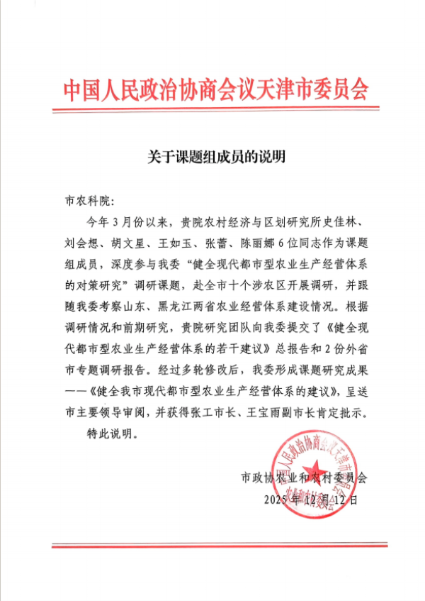 2025年,农经区划所作为主要承担单位,深度参与了天津市政协组织开展的重点调研任务——健全我市现代都市型农业生产经营体系研究。该所科研人员组成专门课题组,全面参与了市政协农业农村委组织的调研、座谈和研讨工作,对十个涉农区相关经营主体进行深度访谈,设计调查问卷,远赴山东、黑龙江开展调研,形成《健全现代都市型农业生产经营体系的若干建议》总报告和2份专题调研报告。根据以上成果,市政协农业农村委最终形成《健全我市现代都市型农业生产经营体系的建议》报送市委、市政府,获得张工市长、王宝雨副市长肯定性批示。该课题是该所密切结合发展需求,立足现实问题开展软科学研究,提出高水平对策建议的成果,体现了服务政府决策能力的进一步提升。