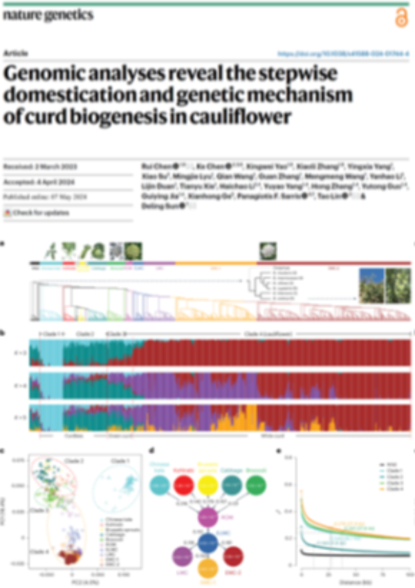(一)基础研究取得重要成果。花椰菜团队历经6年持续攻关,完成了大规模花椰菜种质资源重测序,构建了花椰菜变异组图谱,精准划分了种群结构,在全球首次揭示了优异种质演化规律,突破了种质资源利用率低的瓶颈。构建了花球形成的全景网络调控图,阐明了花球形成分子机制,为花器官发育、花序分生组织特化、花形态建成提供了重要理论依据,并率先挖掘到一批调控花椰菜品质、产量、抗病、抗虫等重要农艺性状的关键基因,缓解了花椰菜基因匮乏的难题,相关研究成果发表于国际权威期刊《Nature Genetics》(IF=30.8)。《Nature》和《Nature Genetics》邀请国际权威专家深度解读了花椰菜基因组演化和花球形成分子机制,给予了高度评价。新华社、科技日报、农民日报等中央权威媒体对研究成果也进行了报道,取得的系列成果标志着我国花椰菜基因组学研究水平跻身国际前列。