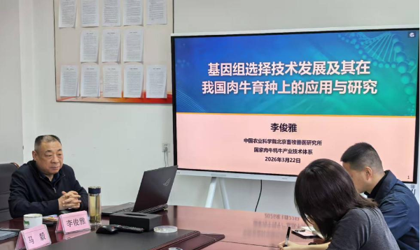 会上,李俊雅以“基因组选择技术发展及其在我国肉牛育种上的应用与研究”为题,梳理了家畜育种技术发展脉络,阐释了基因组选择技术核心原理,介绍了分子育种技术在华西牛育种中的应用实践,并分享了现代育种技术前沿进展。他紧密结合天津市肉牛产业发展实际,围绕品种改良、高效养殖、产业提质增效等关键环节,为我院相关科研工作开展及天津市肉牛产业转型升级,提出了针对性强、实操性高的专业指导与宝贵建议。