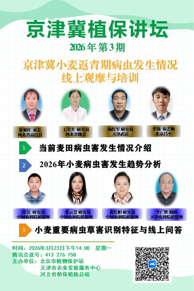 3月23日下午,由北京市植物保护站、天津市农业发展服务中心、河北省植保植检总站联合主办的2026年京津冀植保讲坛(第3期)顺利开讲。本次活动以“京津冀小麦返青期病虫发生情况线上观摩与培训”为主题,通过线上视频会议形式,为三地植保工作者、种植户送上了专业的技术指导。来自三地的植保领域专家,围绕小麦生产中的重点关注内容展开经验分享和授课。
