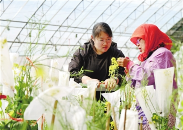科研人员和农技人员正在对花椰菜、白菜等蔬菜进行人工授粉。