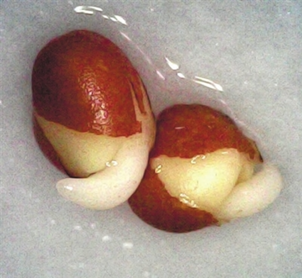 培养皿中,花椰菜种子正在萌芽(放大1000倍)。