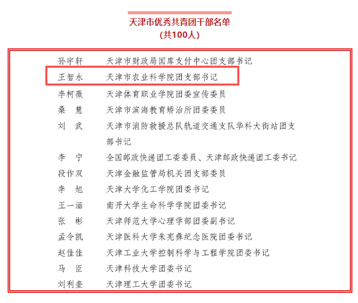 近日,从共青团天津市委员会获悉,我院蔬菜所张小丽同志被授予天津青年五四奖章、院办公室王智永同志被授予天津市优秀共青团干部称号。